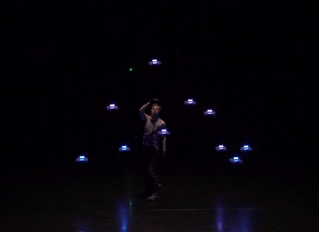 His biggest dream for the technology? Flocking behaviors — murmuration-like movement where a single dancer’s movement could influence an entire swarm of drones through collision avoidance and boid behavior. “Something extremely beautiful,” he said.